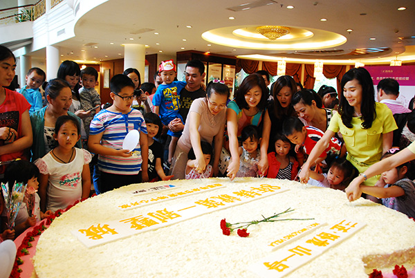 10時許,等待已久的時刻終于到了。“下面我們將邀請幾對母子一起來切蛋糕。”主持人的話音剛落,便有母親領著小孩舉手報名了,幾對母子一起切出“第一刀”。隨著這“第一刀”下去,蛋糕特有的香甜味便在營銷中心內(nèi)彌漫開來,挑撥著人們的食欲。一邊等待的小朋友,饞得直咽口水;而拿到蛋糕的小朋友,則不顧形象地在媒體的鏡頭前大快朵頤,可愛的吃相令人捧腹。